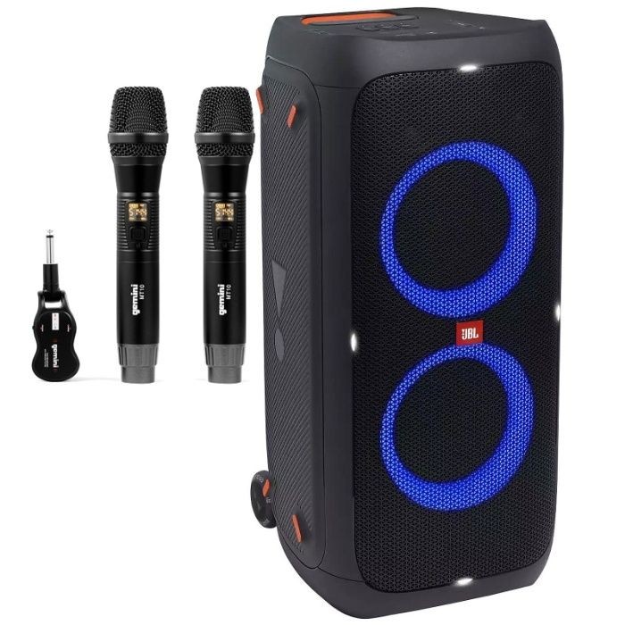 Take your karaoke parties to the next level with the JBL PartyBox 310. This mobile entertainment machine is designed to perform anywhere and everywhere your music takes you. Built-in mic and guitar inputs, perfect for live performances, while a dynamic light show, cool vocal effects and 240 watts of JBL Pro Sound make you look and sound like a rock star. With Bluetooth connectivity and 18 hours of battery life, the entertainment options are endless. Bring life to the party with the JBL PartyBox 310.