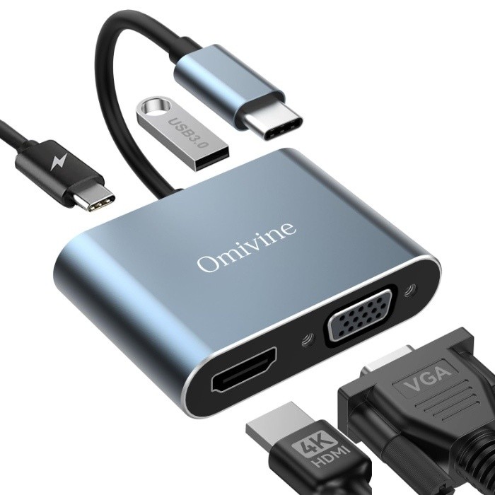 VOOCME USB Type-c 4 in 1 Hub to PD, 4K HDMI, VGA, and USB 3.0 Adapter, Support Screen Projection and USB Multimedia Files Reading for Office.