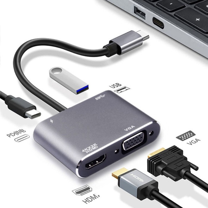 VOOCME USB Type-c 4 in 1 Hub to PD, 4K HDMI, VGA, and USB 3.0 Adapter, Support Screen Projection and USB Multimedia Files Reading for Office.